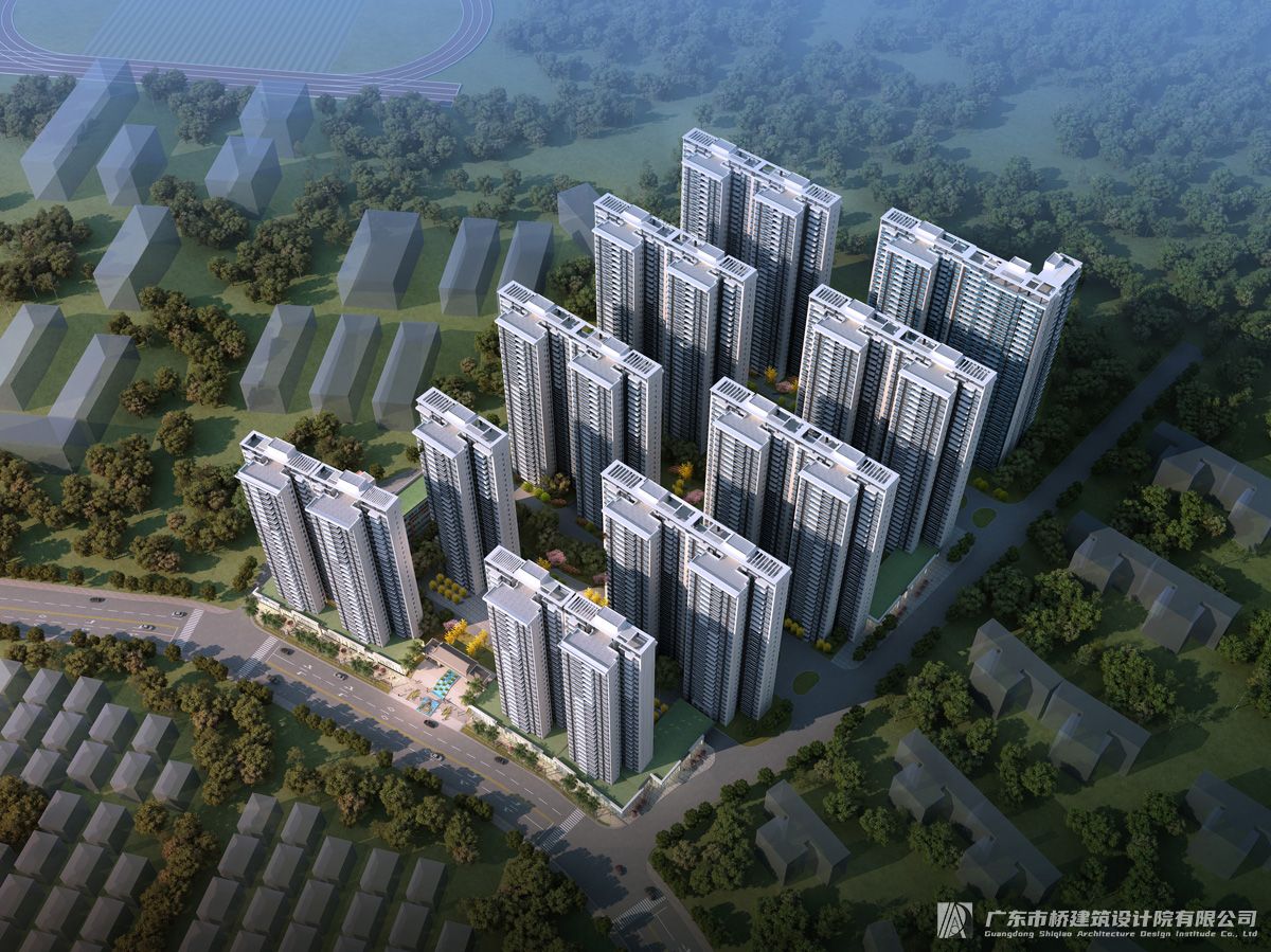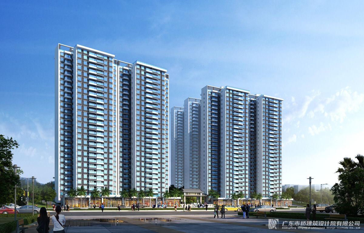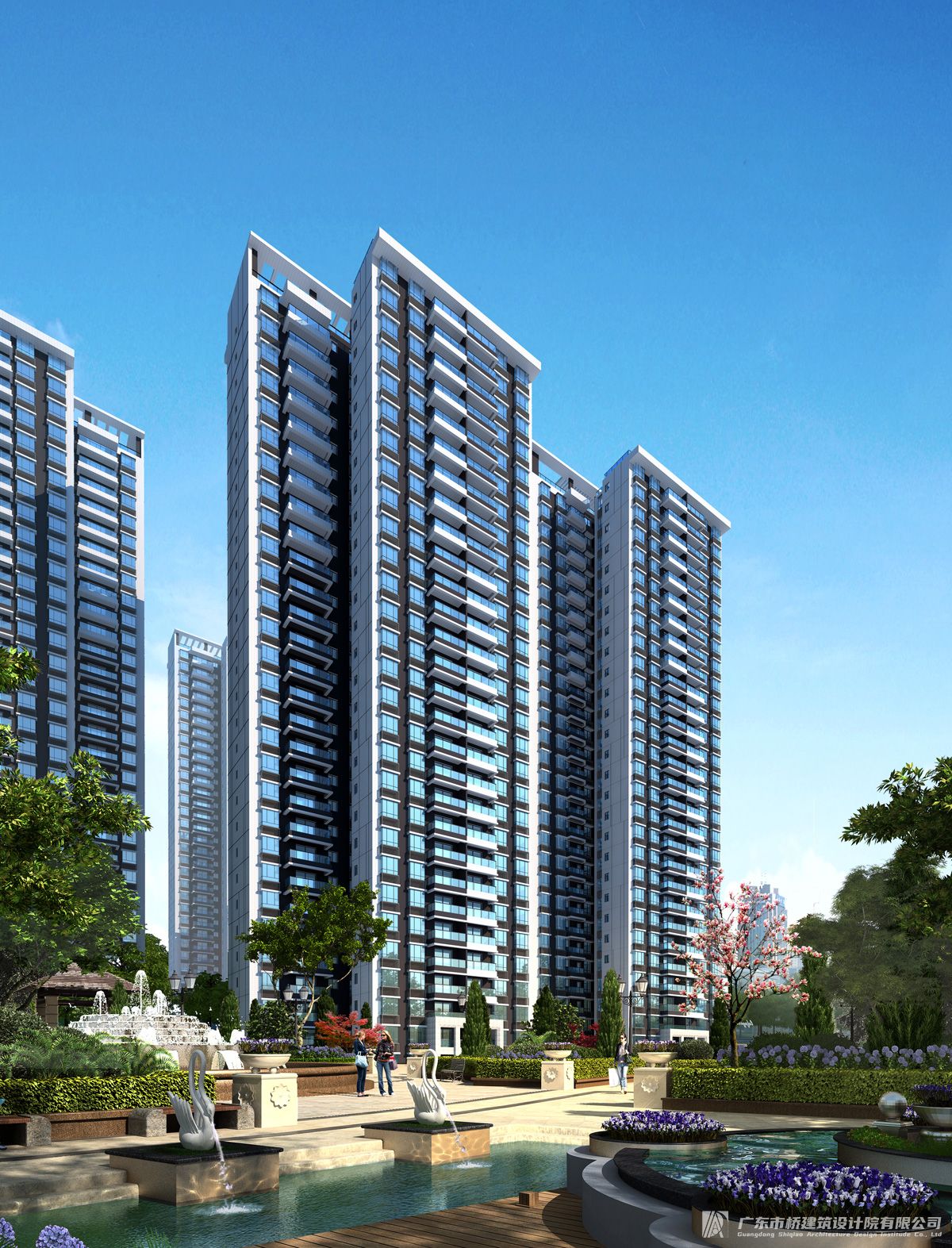 項目用地偏東南呈長方形,因此在建筑布局中,建筑均平行道路正南北偏東48.79度布置,根據地塊體型,沿中軸線,兩側分別布置組團,建筑沿著地勢南低北高分別設計為26,29,31,33層,沿著山體逐漸抬高,與山體結合在一起,層層疊疊,自成韻律。